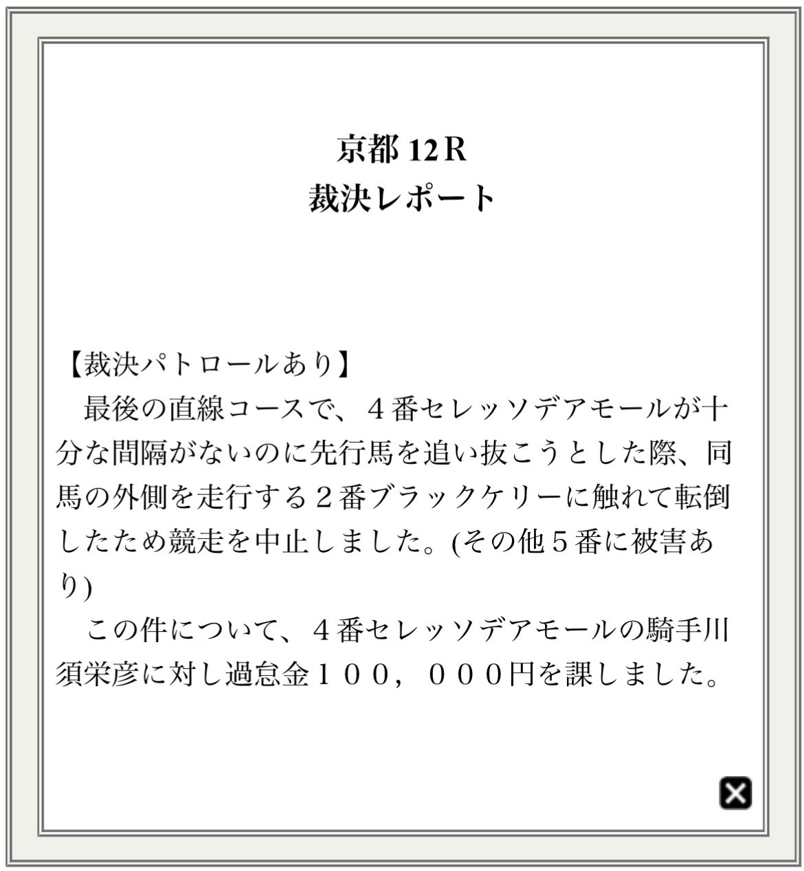 … | 7無題Name名無し 25/10/06(月)19:12:50No.96384+落馬負傷して過怠金…踏んだり蹴ったりですな |