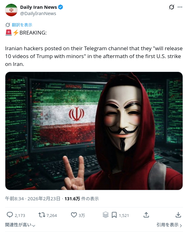 トランプおやびんがイランを攻撃した場合、おやびんと未成年者が一緒にいる動画を10本公開するとイランのハッカーが宣言レス50件省略。全て読むには返信ボタンを押してください。