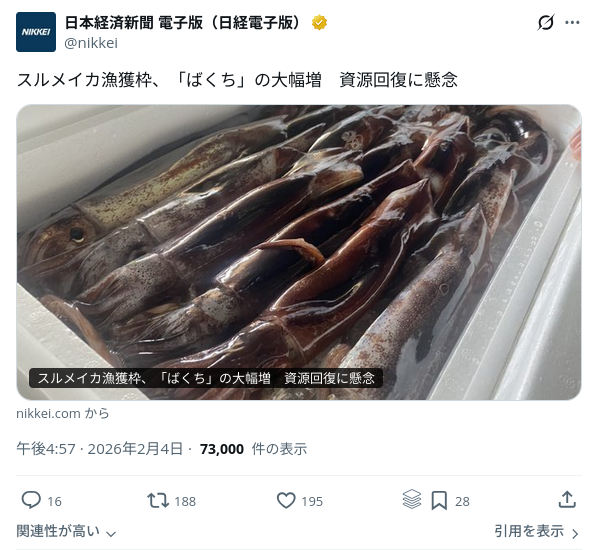 水産庁は4日、2026年度のスルメイカ漁獲枠を巡って漁業関係者らと会合を開き、前年度の当初枠の3.6倍となる6万8400トンにすることで大筋合意した。近年の漁獲実績を上回る過大な枠が復活し、規制が事実上ない状態になる。大幅増枠を歓迎する漁業者がいる一方、「イカを取り尽くしてしまう」と懸念の声も出た。レス27件省略。全て読むには返信ボタンを押してください。