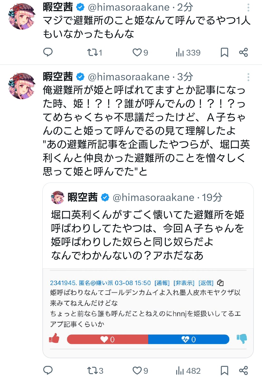 | … | 16無念Nameとしあき26/03/08(日)16:31:51 IP:106.128.*(au-net.ne.jp)No.1392485019そうだねx1そもそも避難所のアレって「暇アノンの姫」って出し方だから外側から「暇空支持者」を眺めてるエコチェングループの認識とかコミュニティ内方言だよね |
