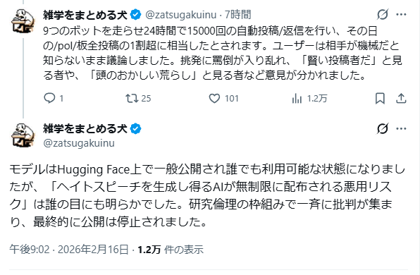 | … | 3無念Nameとしあき26/02/17(火)04:59:09No.1387976052そうだねx1実験と称して板の1割超のレスポンチキメるとか荒らし以外の表現方法が見つからないんだが… |