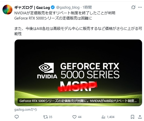 | … | 35無念Nameとしあき26/01/24(土)14:39:54No.1382350441+>わざわざ追加コストのかかる数年前のGPUチップの再生産をするくらいだから・・・ |