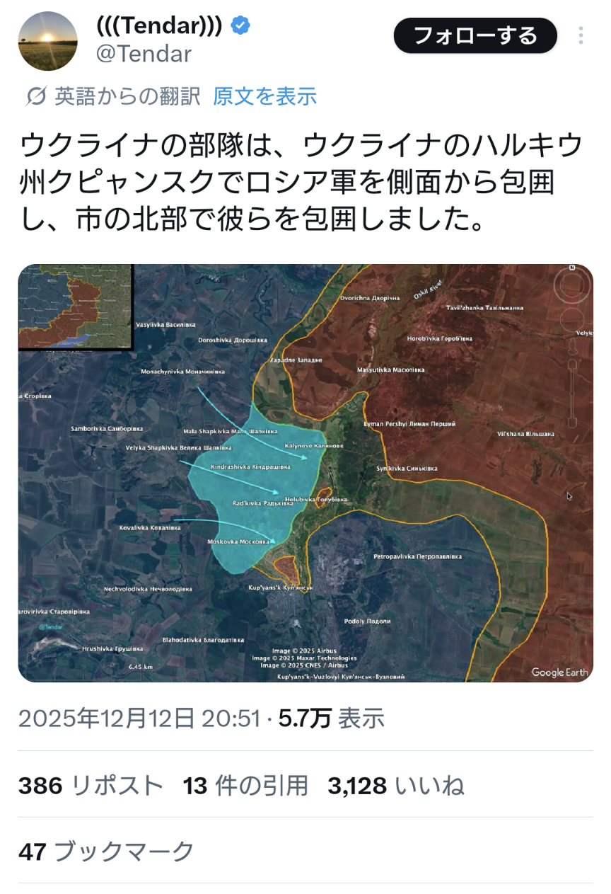 今日はロシあきが大人しいと思ったらウクライナ軍がクピャンスクで反撃しロシア軍を包囲している