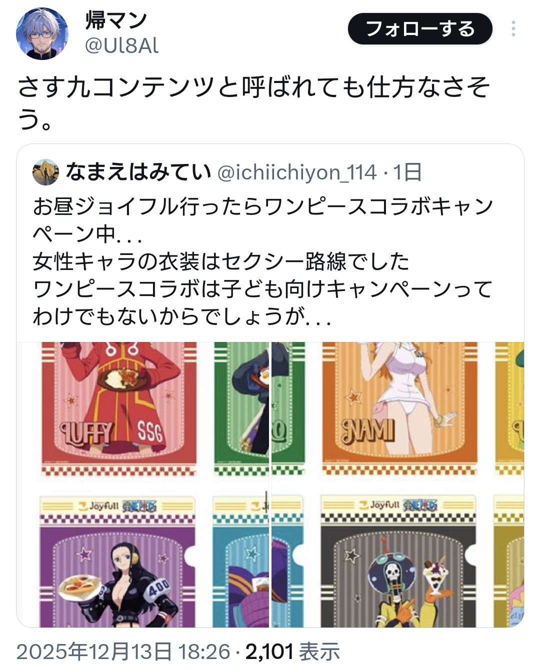 | … | 35無念Nameとしあき25/12/14(日)04:40:17No.1372904217+ 1765654817330.jpg-(261897 B) ツイフェミはワンピースコラボを徹底的に叩いてやるってさ |
