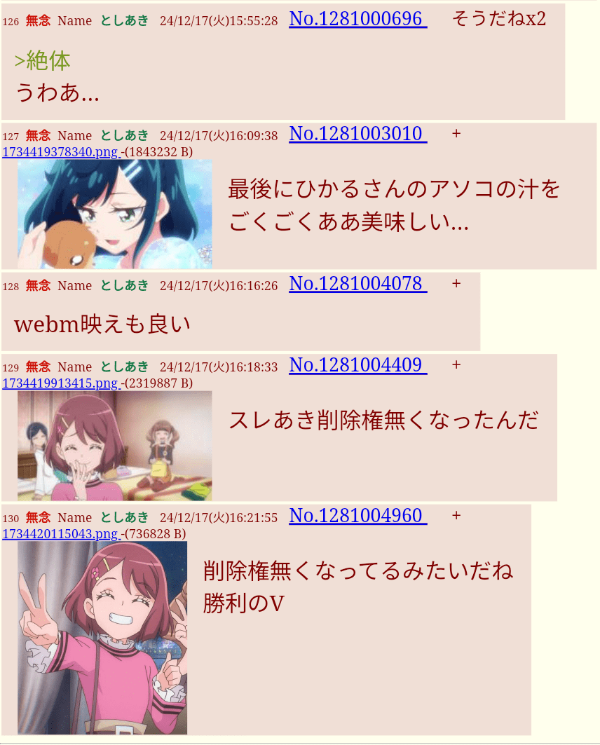 | … | 78無念Nameとしあき26/02/26(木)21:42:48No.1390231050+おっぱいをペロペロ舐められながら犯されているウイングマンの夢あおい、または森本桃子をお願いします |