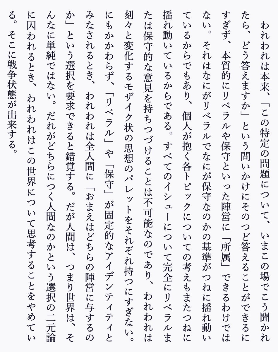 「リベラルか保守かの二元論に囚われているから争いが生まれるんだよ」