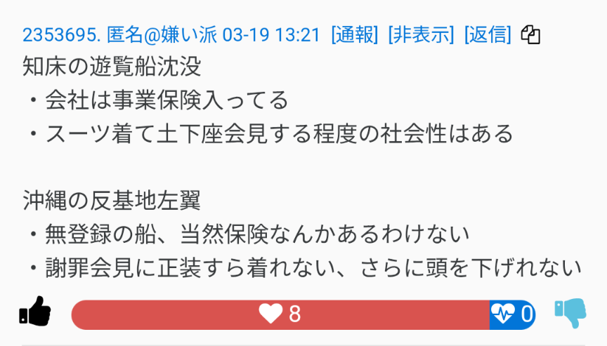 | … | 14無念Name🐼26/03/19(木)13:33:56 IP:153.173.*(ocn.ne.jp)No.1394883661そうだねx5>知床の時と比較しても酷いな |