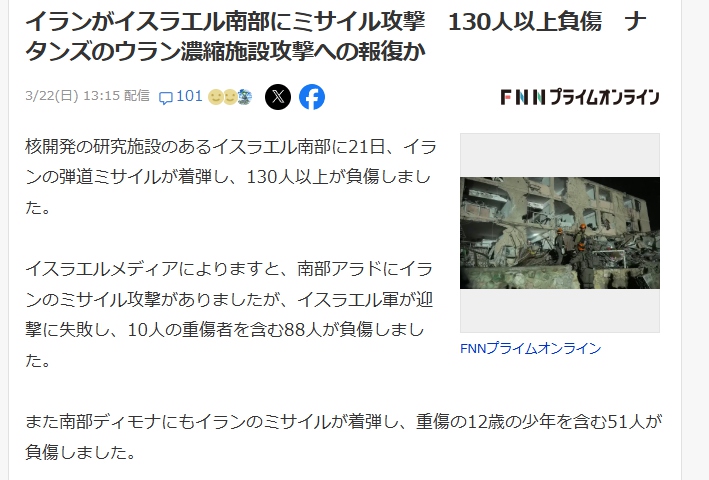 | … | 26無念Nameとしあき26/03/22(日)18:54:04No.1395663403+>>イスラエルミサイル落ちまくってるってな |