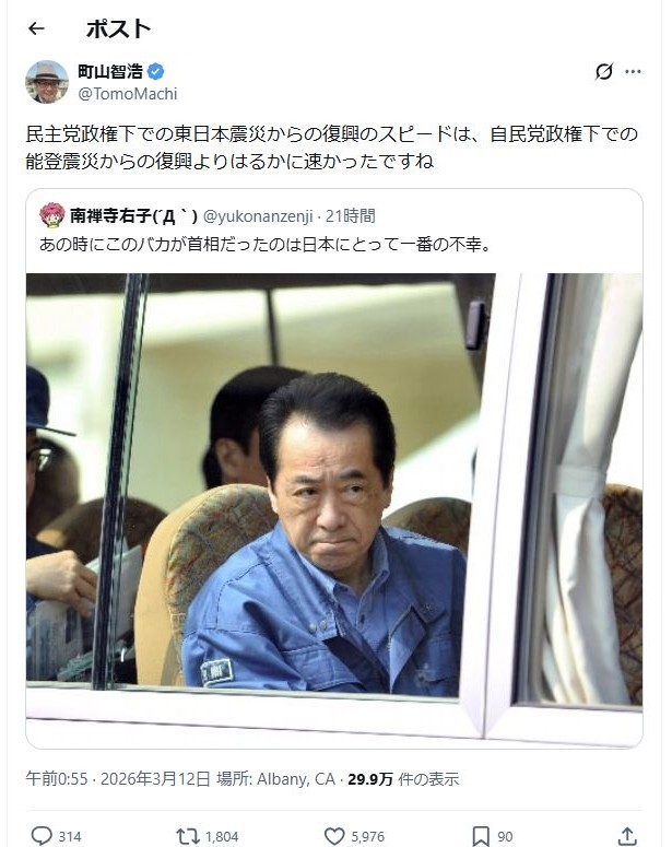 民主党政権下での東日本震災からの復興のスピードは、自民党政権下での能登震災からの復興よりはるかに速かったですね