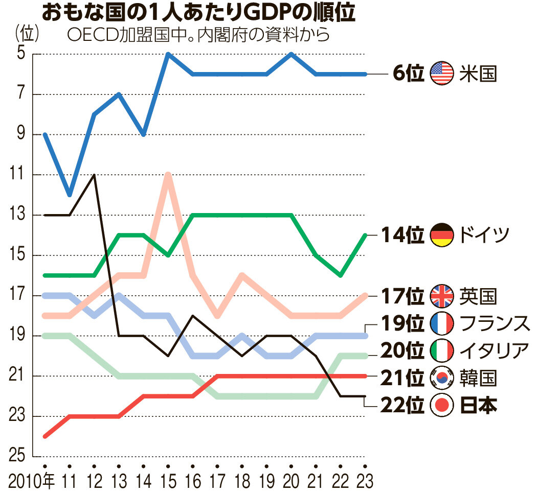 過去最低だった23年の22位からさらに二つ順位を下げた。スペインとスロベニアに抜かれ、21位の韓国(3万6239ドル)の背中が遠のいた。