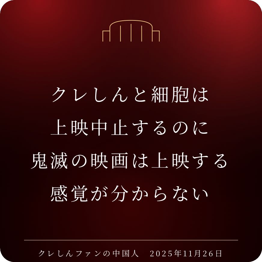 | … | 15無念Nameとしあき25/12/25(木)02:32:38No.1375410670+ 1766597558118.jpg-(56746 B) なんで鬼滅は上映したのかなー? |