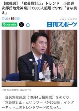 … | 971無念Nameとしあき25/09/30(火)23:11:22No.1355320900+1000なら進次郎総裁爆誕 |