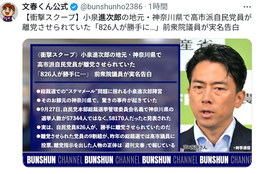 【文春】《衝撃スクープ》小泉進次郎の地元自民党神奈川県で高市派自民党員が削除されていた… 前衆院議員が実名告白 高市氏支持の中山展宏前衆院議員「私がお願いして党員になってもらった826人が、今年6月に勝手に離党させられていたことが発覚したのです」