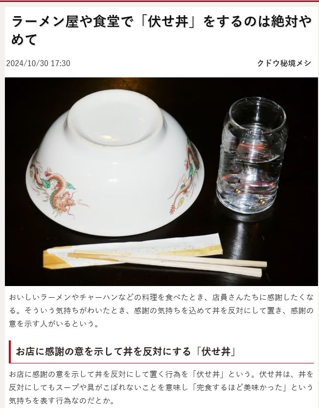 … | 11無念Nameとしあき25/10/02(木)21:55:16No.1355739922そうだねx21>地元のラーメン店で「完食した証」として丼を伏せる習慣が生まれ、SNSを通じて全国に広まったとされています |