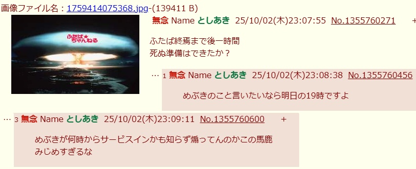 … | 20無念Nameとしあき25/10/03(金)03:25:48No.1355794157そうだねx7>また同じタイミングで |