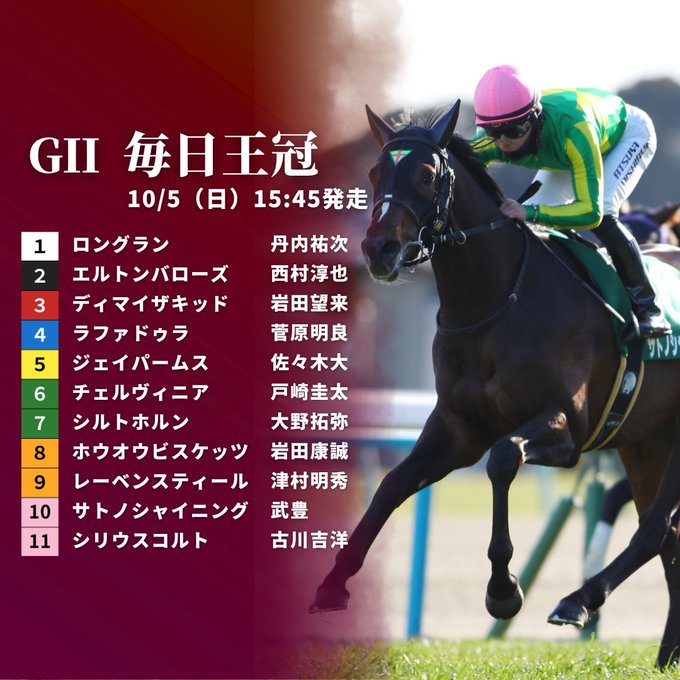 … | 36無念Nameとしあき25/10/03(金)11:17:25No.1355831170そうだねx1 1759457845979.jpg-(88310 B) ![]() 【#毎日王冠】枠順が決定!👏 前走のダービーで4着のサトノシャイニングは8枠10番、昨年のオークス馬チェルヴィニアは6枠6番となりました。 |