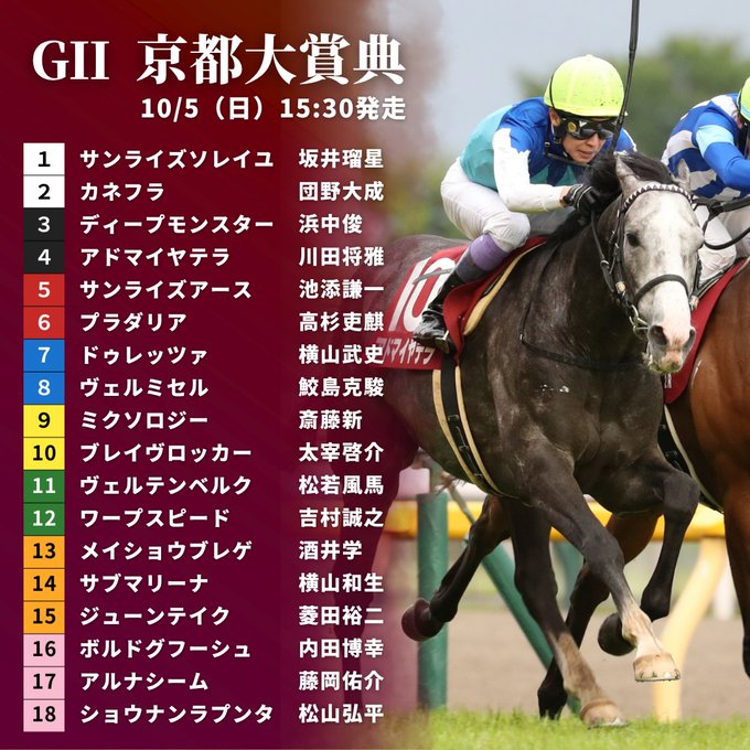 … | 37無念Nameとしあき25/10/03(金)11:18:17No.1355831283そうだねx1 1759457897152.jpg-(116716 B) ![]() 【#京都大賞典】枠順が決定!👏 目黒記念の覇者アドマイヤテラは2枠4番、宝塚記念で4着だったショウナンラプンタは8枠18番となりました。 |