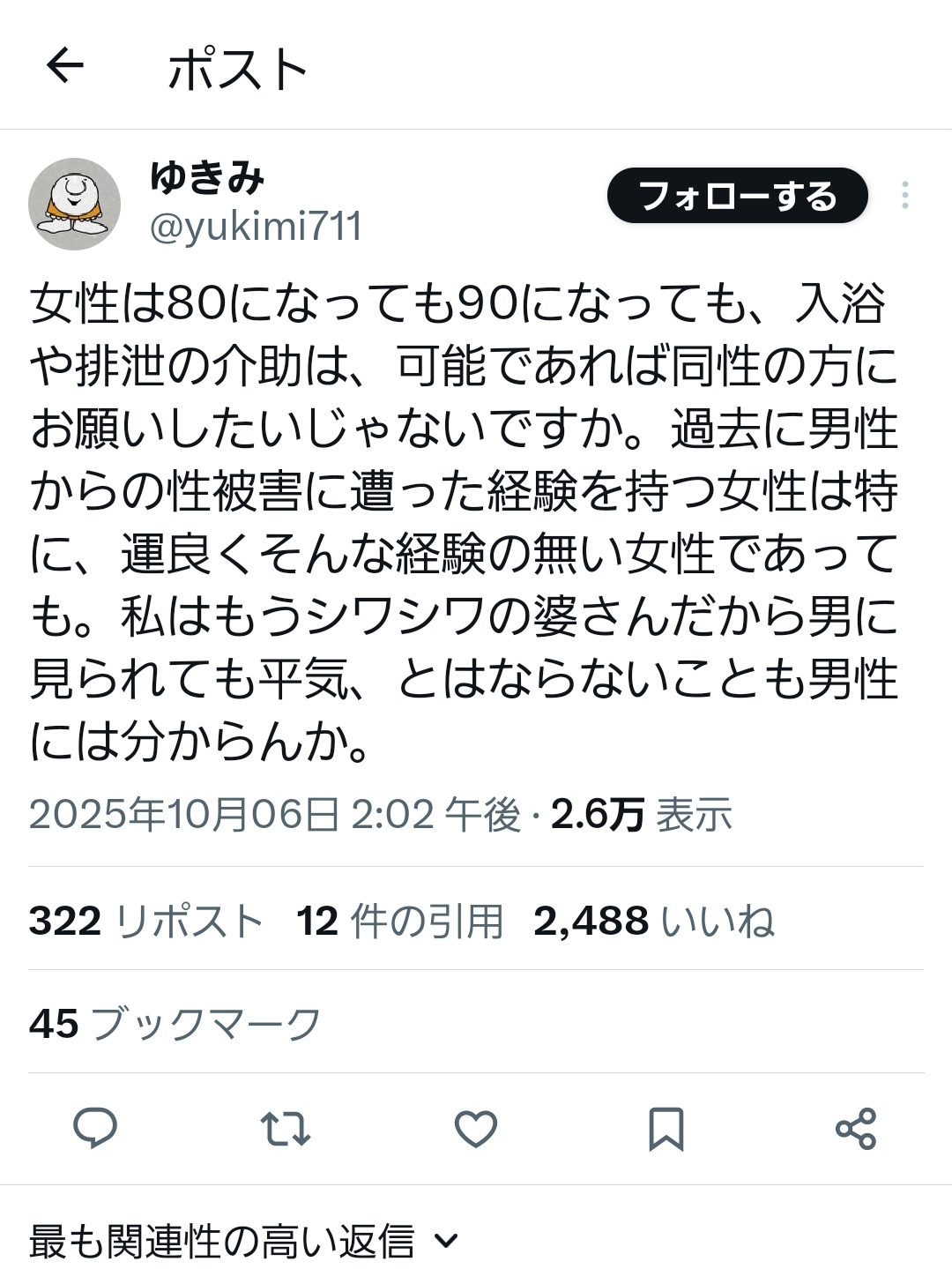 … | 62無念Nameとしあき25/10/07(火)00:38:05No.1356818552+>介護フェミニスト |