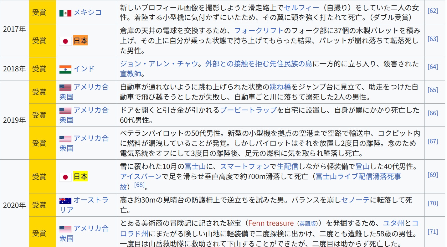 … | 127無念Nameとしあき25/10/08(水)14:54:16No.1357135613そうだねx12020年に受賞した日本人男性の事例では、ダーウィン賞公式サイトでの事件の紹介が実態と乖離したミスリードとなっていたことが指摘されており、賞の信頼性を疑問視する意見もある |