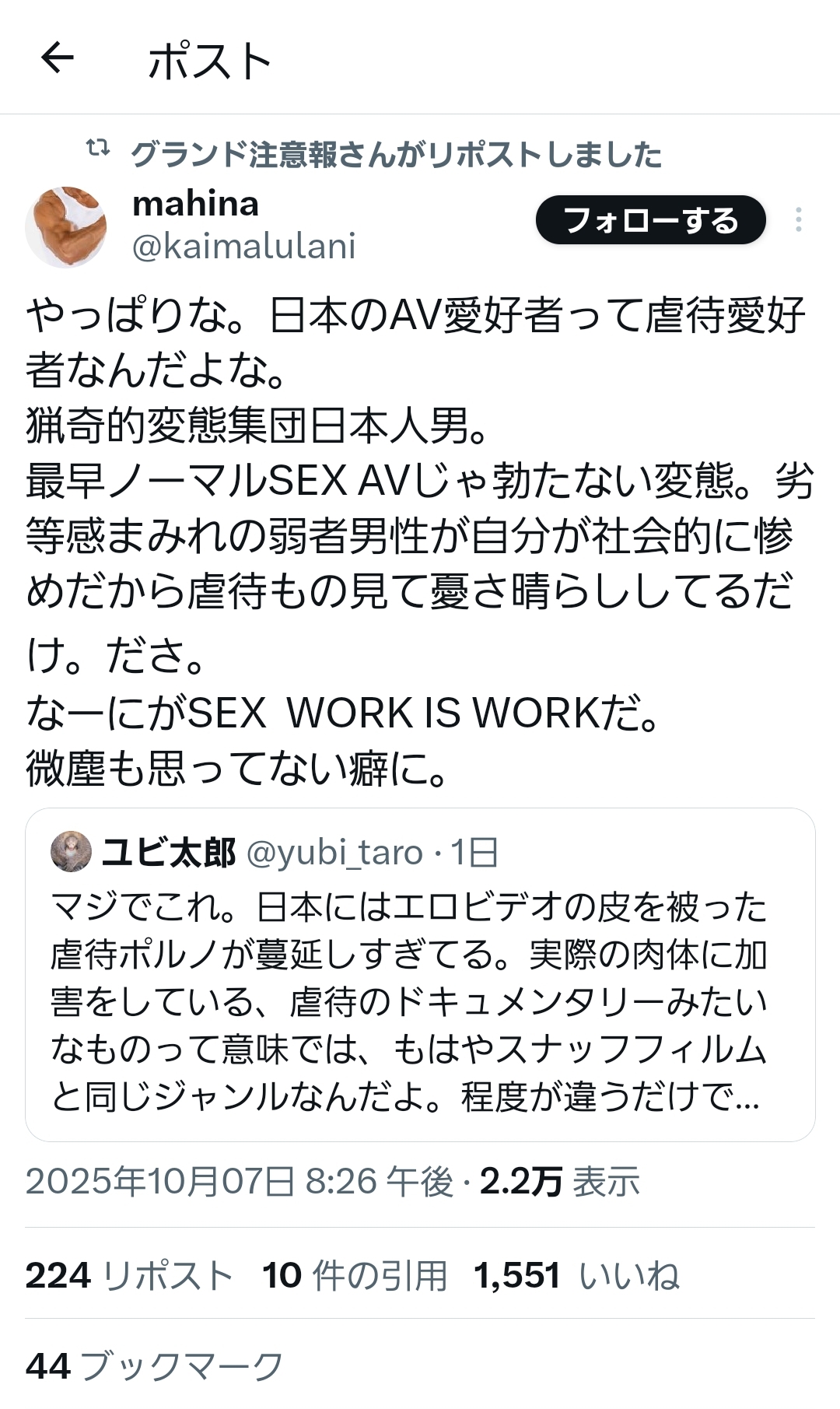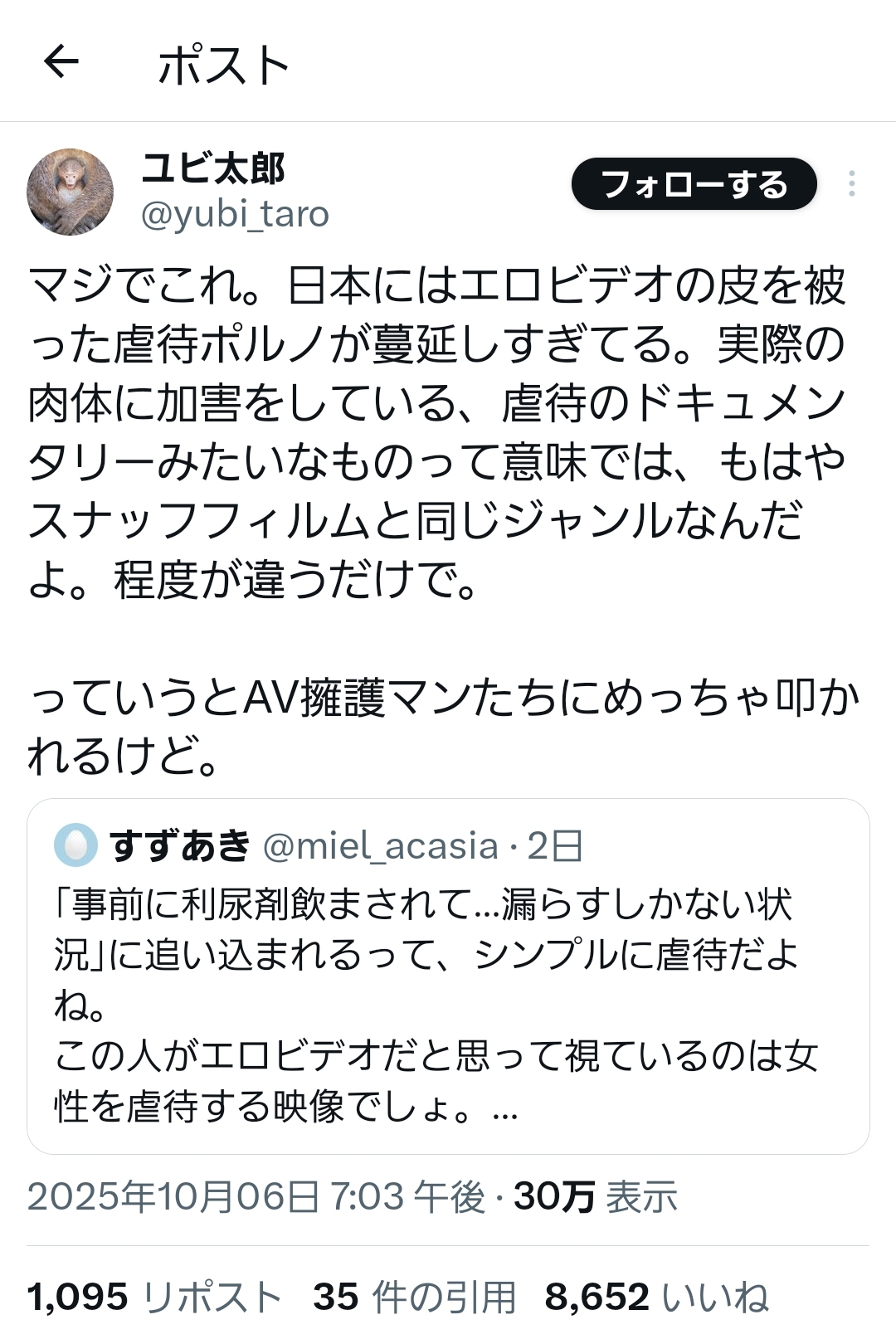 … | 2無念Nameとしあき25/10/08(水)12:49:16No.1357115262+ 1759895356112.jpg-(513544 B) ![]() マジでこれ。日本にはエロビデオの皮を被った虐待ポルノが蔓延しすぎてる。実際の肉体に加害をしている、虐待のドキュメンタリーみたいなものって意味では、もはやスナッフフィルムと同じジャンルなんだよ。程度が違うだけで。 |
