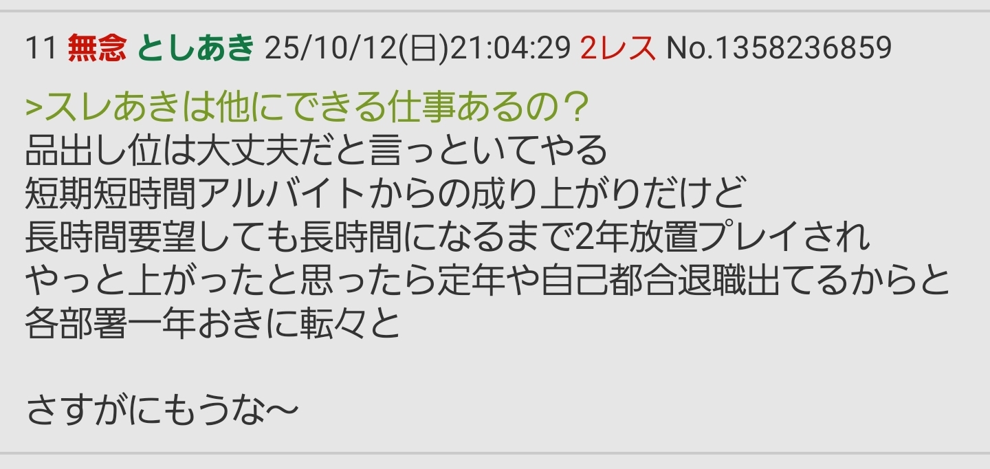 … | 30無念Nameとしあき25/10/13(月)09:45:54No.1358354170+>社員はバイトと違って上の意向で人事異動させられるからな |