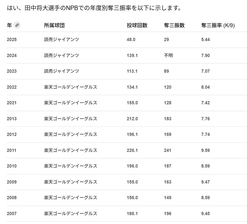 … | 16無念Nameとしあき25/10/13(月)09:35:05No.1358352246そうだねx4>参考までに田中の奪三振率 |