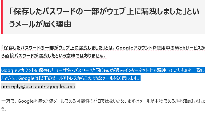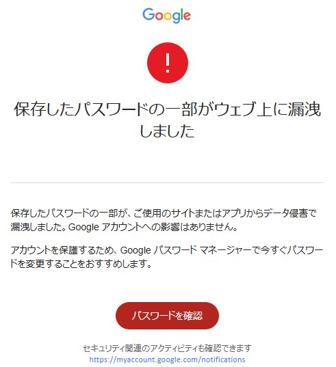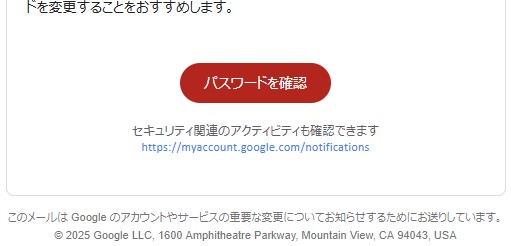 … | 1無念Nameとしあき25/10/13(月)20:55:03No.1358515920そうだねx2これはメールではなく、おそらくGoogle Chromeなどのブラウザ、またはGoogleアカウントの設定画面などで表示された警告メッセージですね。画像を見る限り、Googleが提供している機能の一部です。 |