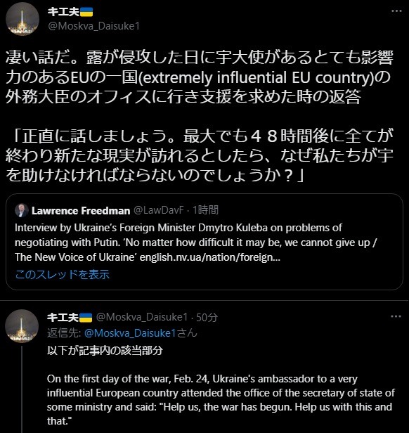 … | 917無念Nameとしあき25/10/14(火)02:21:44No.1358590459そうだねx3まぁ実際ゼレンスキーが首都に残って戦う意志を示したのは内外に大きな影響を与えたとは思う |