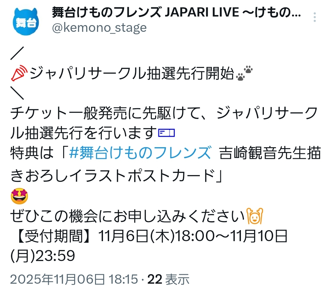 | … | 35無念Nameとしあき25/11/06(木)18:41:18No.1364210956+とりあえずライブは土日の4公演を1枚ずつ抽選にかけてみた |