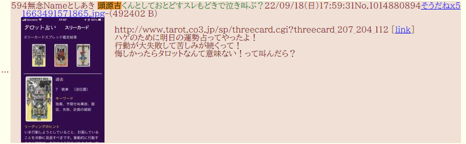 | … | 201無念Nameとしあき25/11/06(木)22:24:23No.1364274331+>避難所裏で荒らしにタロットが効いてると書き込む謎の統失が現れた |
