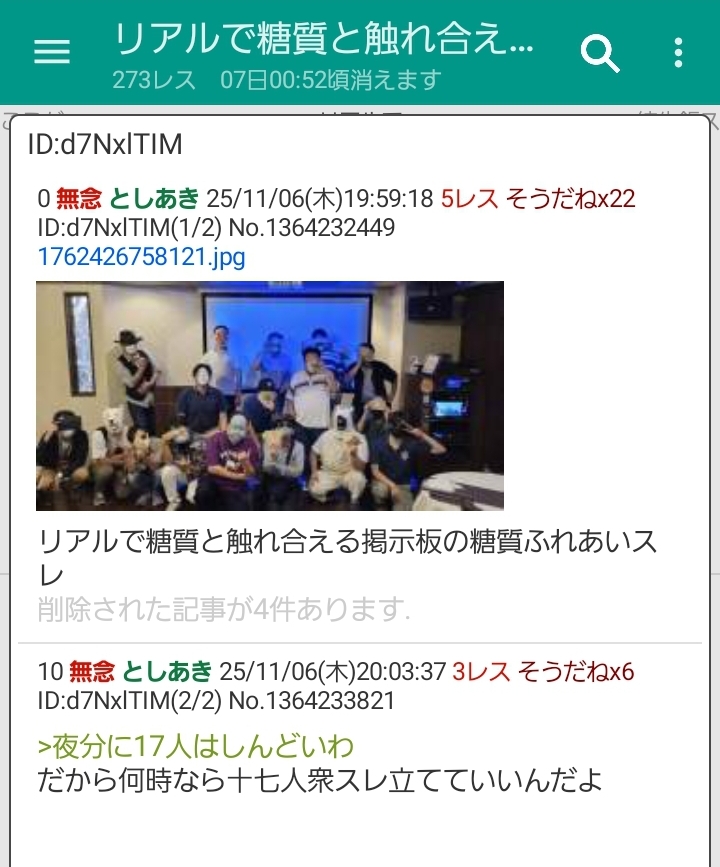 | … | 204無念Nameとしあき25/11/06(木)22:24:43No.1364274425そうだねx4晒されたくないならオフ会で写真なんて撮らんかったらよかったんやな |