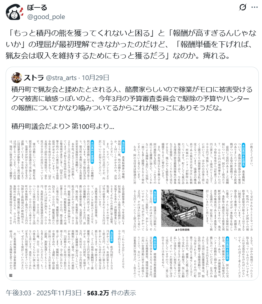 | … | 953無念Nameとしあき25/11/07(金)23:51:40No.1364513343+>>よそ頼るんじゃなくて地元で猟友会みたいな組織立ち上げて1から育成するか人材を他所から移住させれば良いと思うよ |