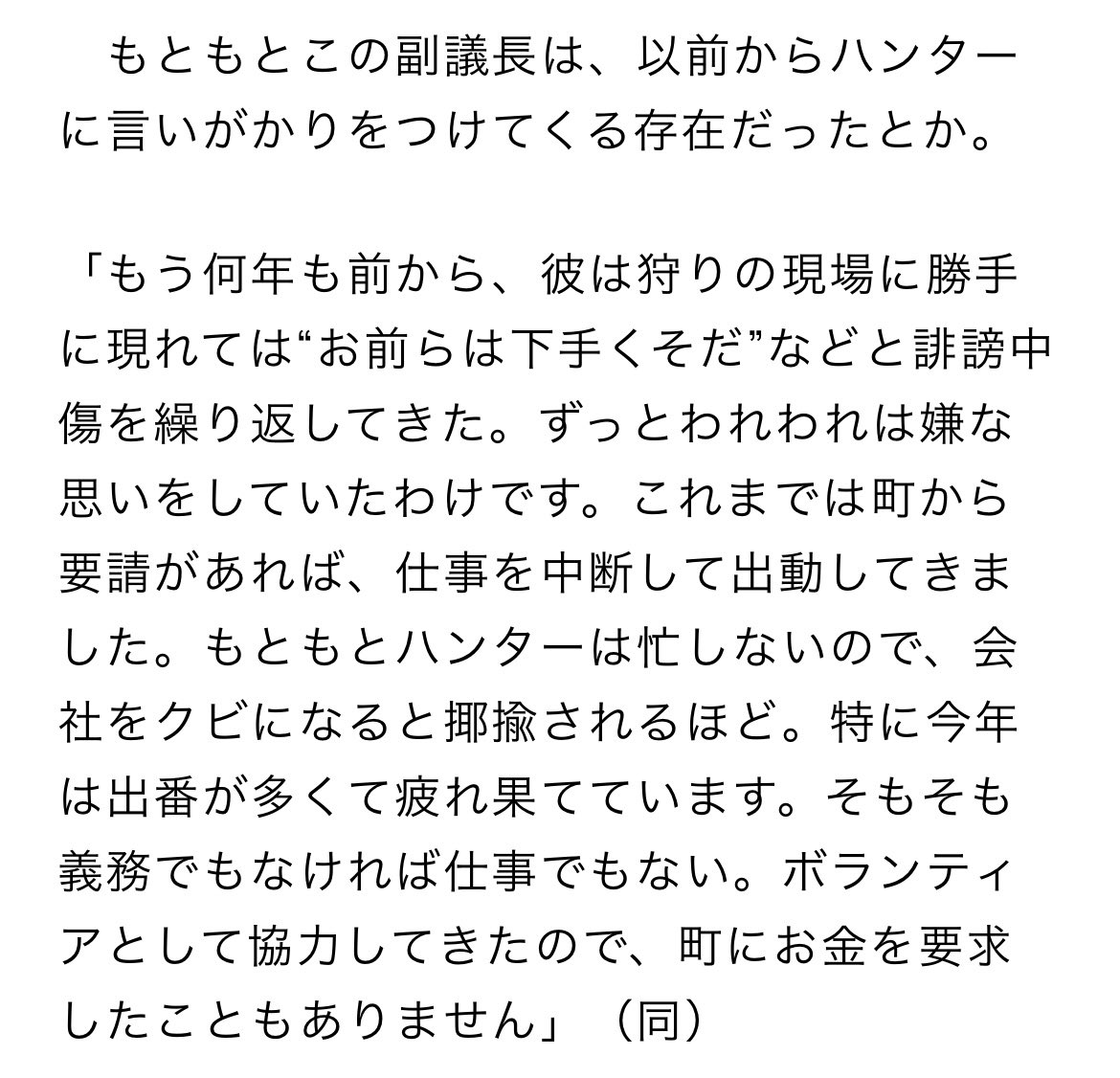 | … | 981無念Nameとしあき25/11/07(金)23:58:52No.1364515001+>副議長がハンターに暴言はいた現場に役場の人間も立ち会っててその発言聞いてた&それで猟友会が出動停止したのを知ってたのに |