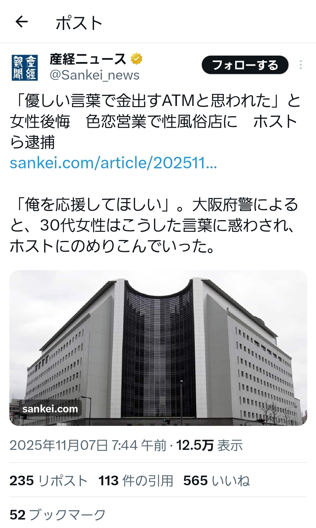 | … | 28無念Nameとしあき25/11/09(日)10:55:35No.1364850520+>ホストクラブで多額の売掛金(ツケ)を抱えた女性を性風俗店に斡旋(あっせん)したとして、大阪府警生活安全特別捜査隊は、職業安定法違反容疑でスカウトグループやホストなどの男7人を逮捕したと発表した。 |
