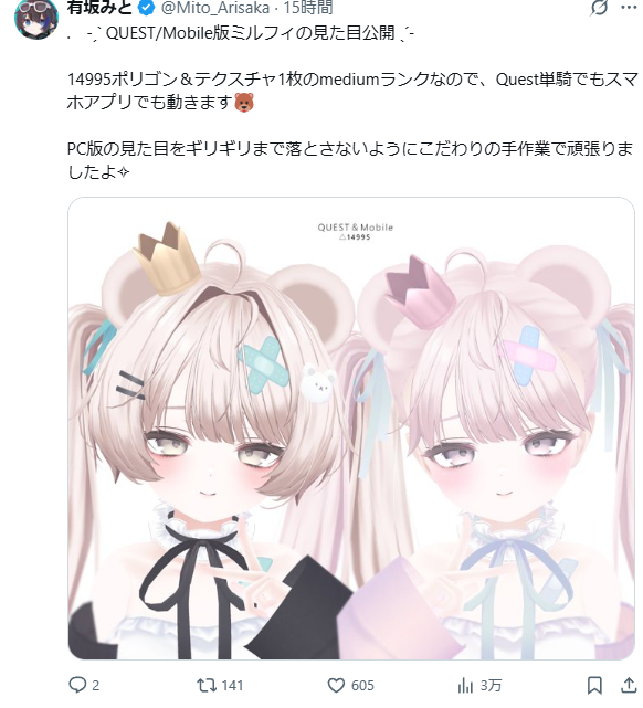 | … | 140無念Nameとしあき25/11/10(月)15:55:26No.1365160083+パブリックや集まり用の軽いアバターにはakyoがいるからな |