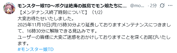 | … | 186無念Nameとしあき25/11/10(月)15:38:05 ID:4T7r3RJ2No.1365157144そうだねx6>>11/10(金)16:00〜17:00に臨時メンテナンスを実施いたします。 |