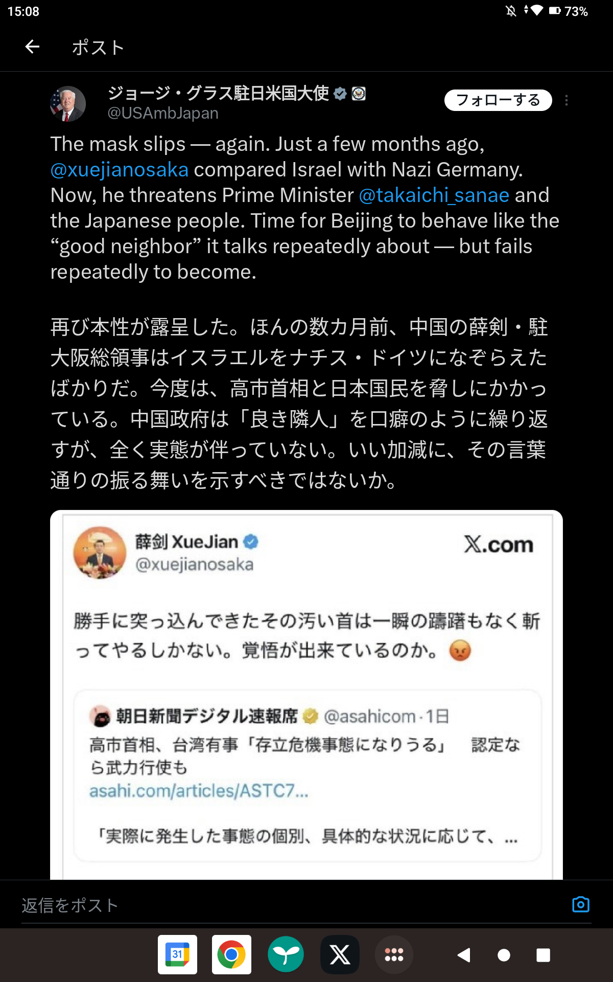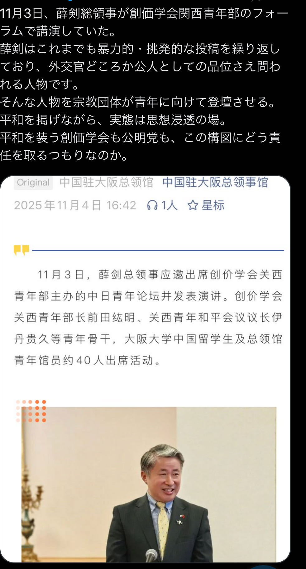| … | 175無念Nameとしあき25/11/10(月)15:33:39No.1365156406+領事館のトップがこんな発言してるのは怖いな |