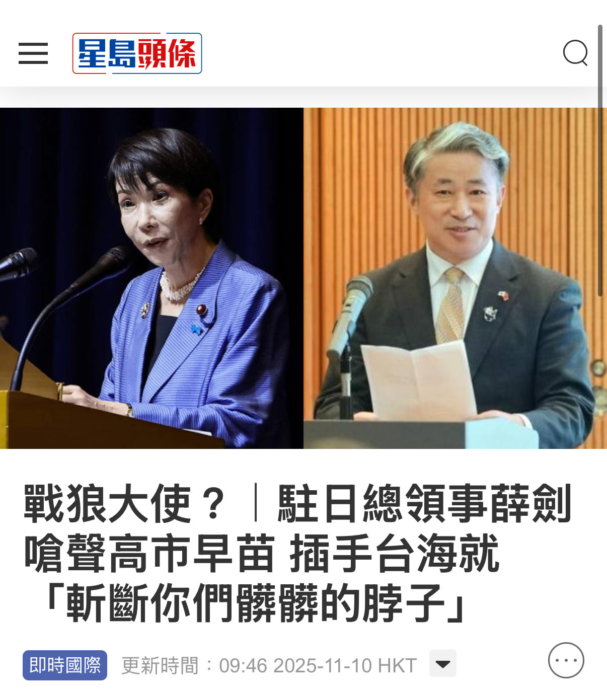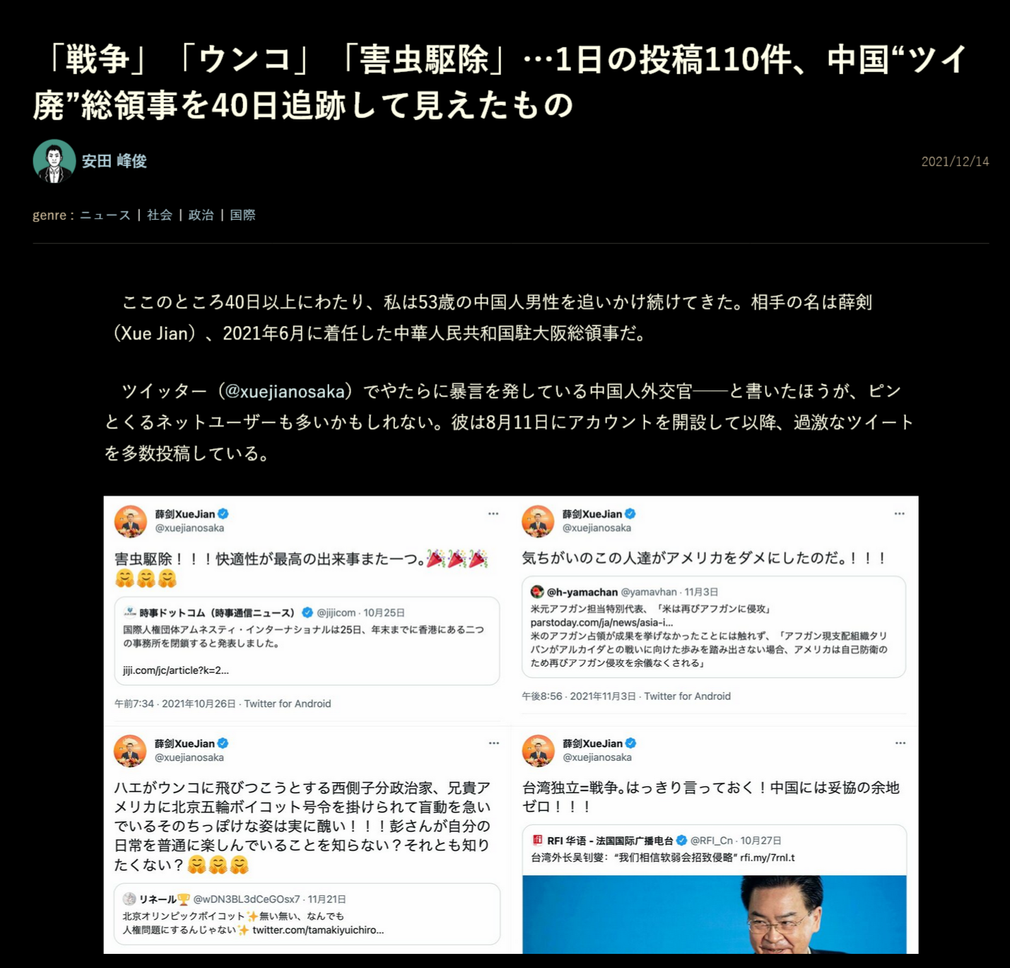 | … | 180無念Nameとしあき25/11/10(月)15:35:37No.1365156752そうだねx1日中外交のために中国政府が正式派遣した駐日総領事が日本の総理を「殺す」と発言 |