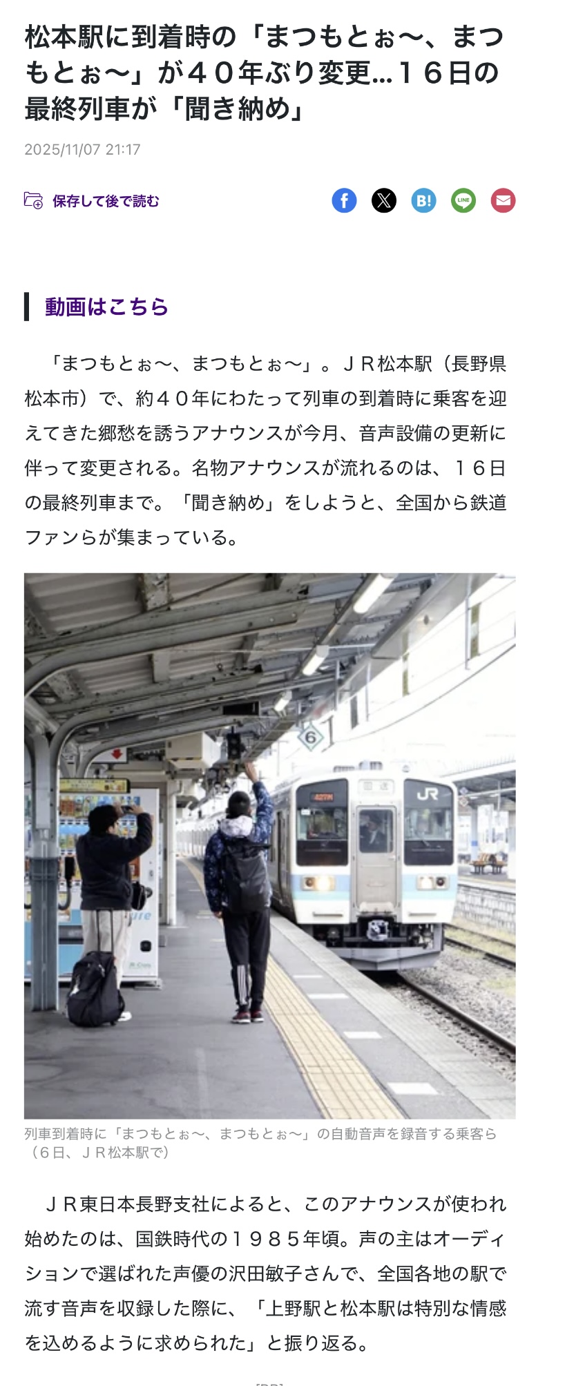 | … | 151無念Nameとしあき25/11/11(火)16:15:15No.1365377234そうだねx3 1762845315096.jpg-(403794 B) 駅メロディといえば松本おばさんの「まつもとぉ〜まつもとぉ〜」も今週末で聞き納めになる |