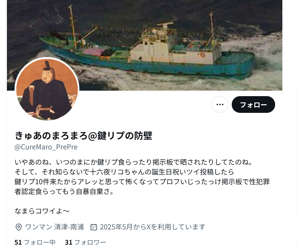 「いやあのね、いつのまにか鍵リプ食らったり掲示板で晒されたりしてたのね。そして、それ知らないで十六夜リコちゃんの誕生日祝いツイ投稿したら鍵リプ10件来たからアレッと思って怖くなってプロフいじったっけ掲示板で性犯罪者認定食らってもう自暴自棄さ」