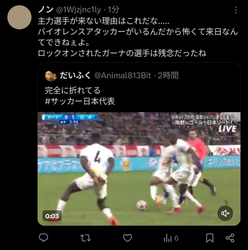 | … | 15無念Nameとしあき25/11/14(金)23:27:35No.1366160102そうだねx17シュートするタイミングで無理矢理足を捩じ込まれたわけでむしろ日本の選手が怪我しなくて良かった |