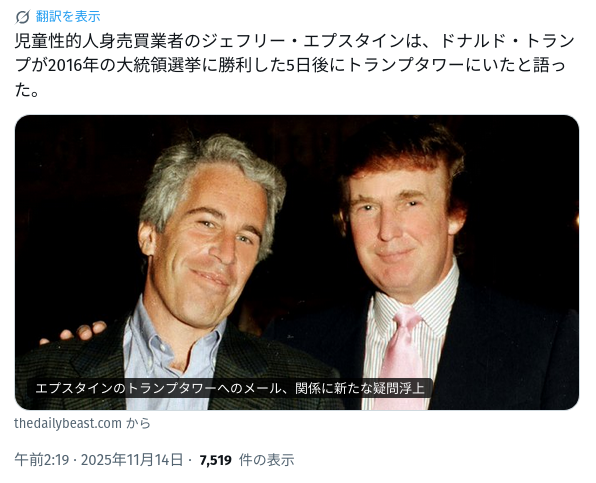 | … | 14無念Nameとしあき25/11/15(土)09:33:02No.1366217571そうだねx4>ABCNEWSやCNNはエプスタインとマクスウェルが |