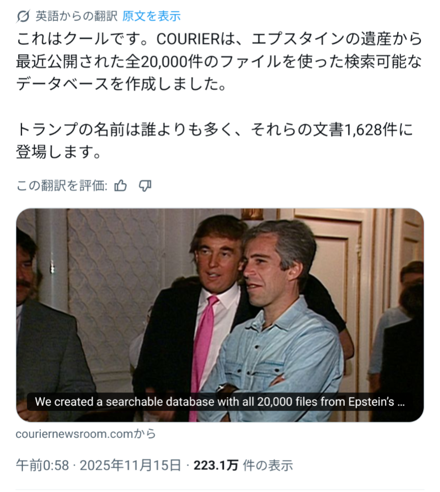 | … | 4無念Nameとしあき25/11/15(土)09:26:27No.1366216579そうだねx2>ついこの前までエプスタインは陰謀論と言ってた奴らがそういう事を声高らかに言っている |
