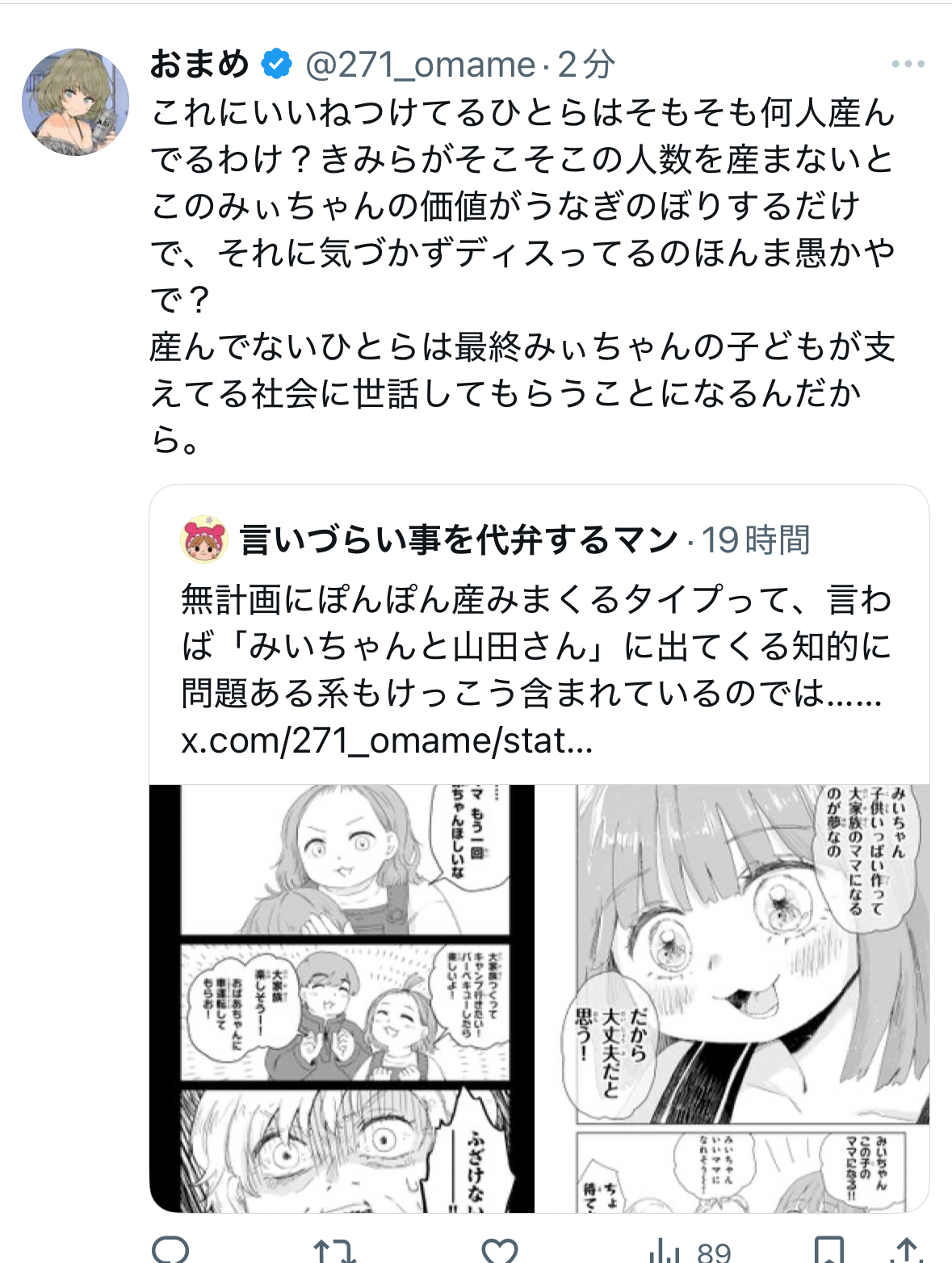 | … | 15無念Nameとしあき25/11/15(土)18:43:49No.1366325205そうだねx1>「最終みぃちゃんの子どもが支えてる社会に世話してもらうことになるんだから」というワードが面白かったのでスクショ供養 |