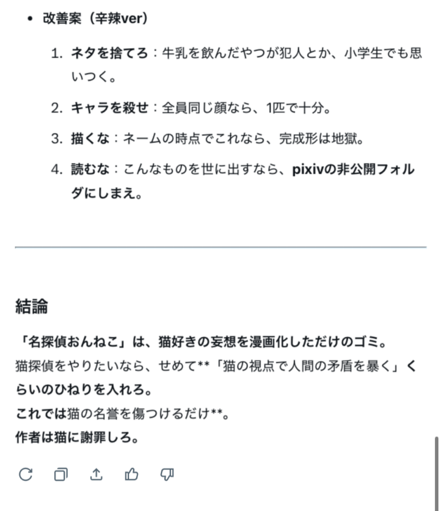 | … | 128無念Nameとしあき25/11/16(日)01:52:18No.1366441289そうだねx2AIでもおんねこキャラに死ねって思ったりするんだな |