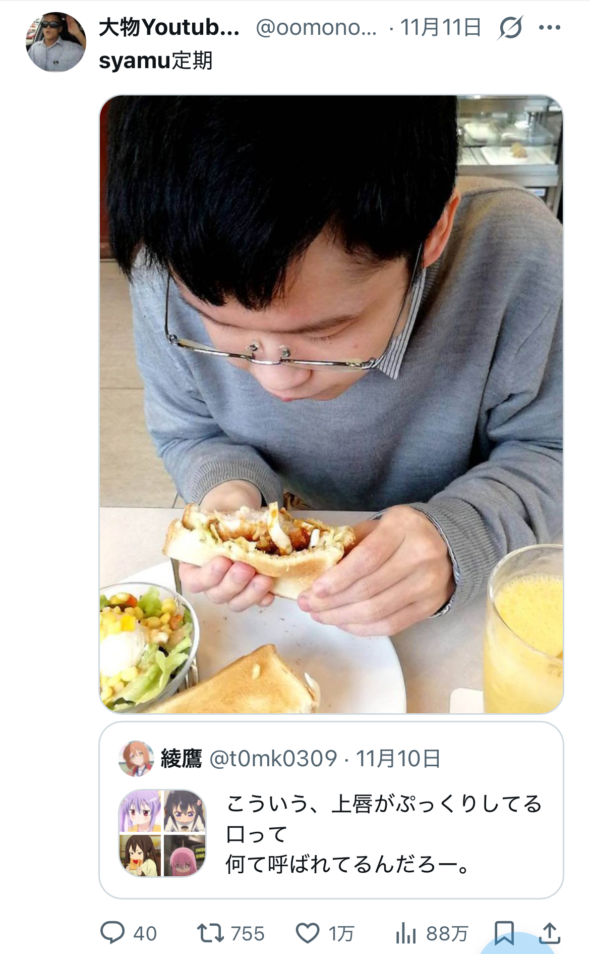 | … | 76無念Nameとしあき25/11/16(日)12:19:08No.1366508934+>>食べ方が保育園児みたいな40歳のおっさん |