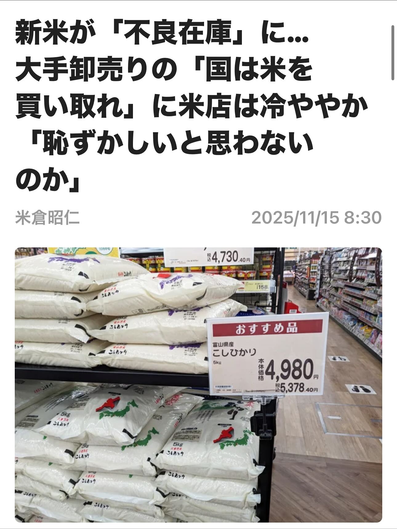 米屋溜息「新米が高すぎて売れない」