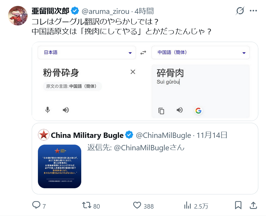 | … | 58無念Nameとしあき25/11/16(日)11:23:31No.1366497852そうだねx12>これにツッコミ入れてる垢に中国語で反論 |