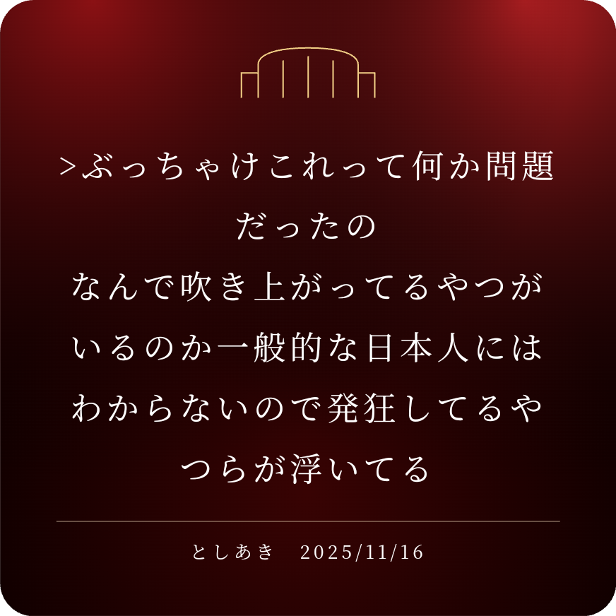 | … | 270無念Nameとしあき25/11/16(日)14:10:04No.1366532193そうだねx3これがただの中国人なら日本語不自由ねで終わるんだが |