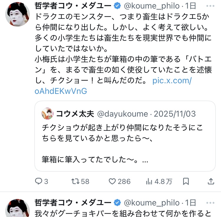 | … | 89無念Nameとしあき25/11/16(日)10:16:36 ID:BMB.GHnkNo.1366484808+コウメ太夫も封印なの? |